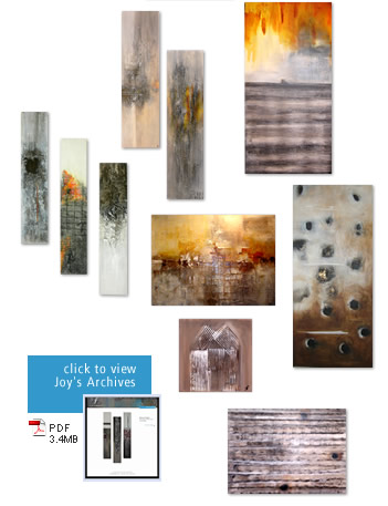 gallerySelect recent workThis online gallery contains a selection of recent original paintings by Joy Finney. Click any of the images on the right to view an enlarged detail of each painting and more information on each. Additional paintings and previously featured work may be viewed in the archives [3.4MB PDF file]. Adobe Acrobat reader is required to view the archived work. Click here to download the Acrobat Reader plugin from Adobe. Due to the textural qualities of Joy Finney's technique, her work is best viewed in situ to be truly appreciated. For more information on current exhibitions and shows click here.